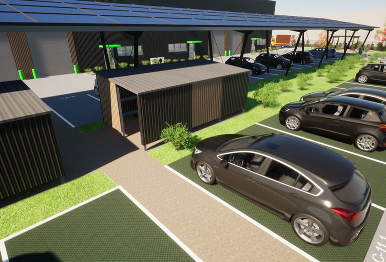 Les parcs inclus parfois en plus des toitures solaires photovoltaïques des ombrières solaires produisant de l'électricité propre mises à disposition aux bornes de recharge électrique pour les véhicules rechargeables.