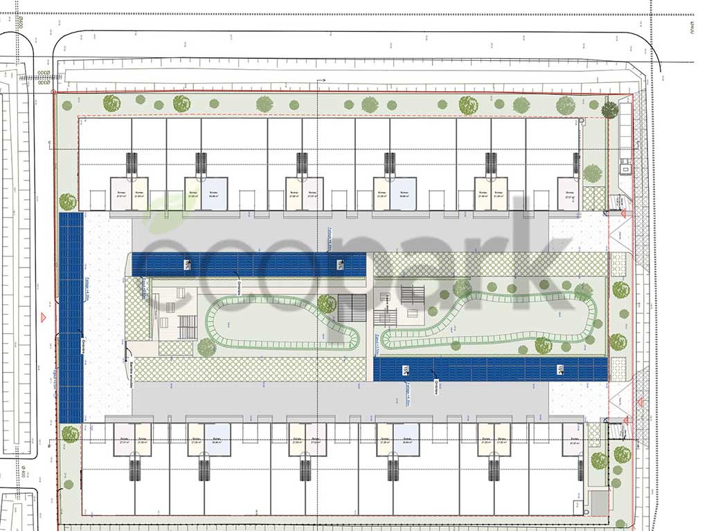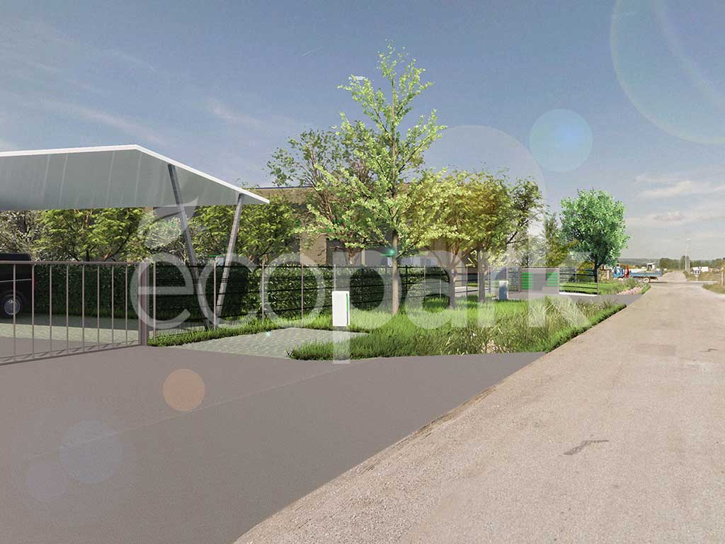 Les écopark sont munient d'ombrières solaires photovoltaïques avec bornes de recharge électrique et d'espaces "rencontre" paysagés et arborés.