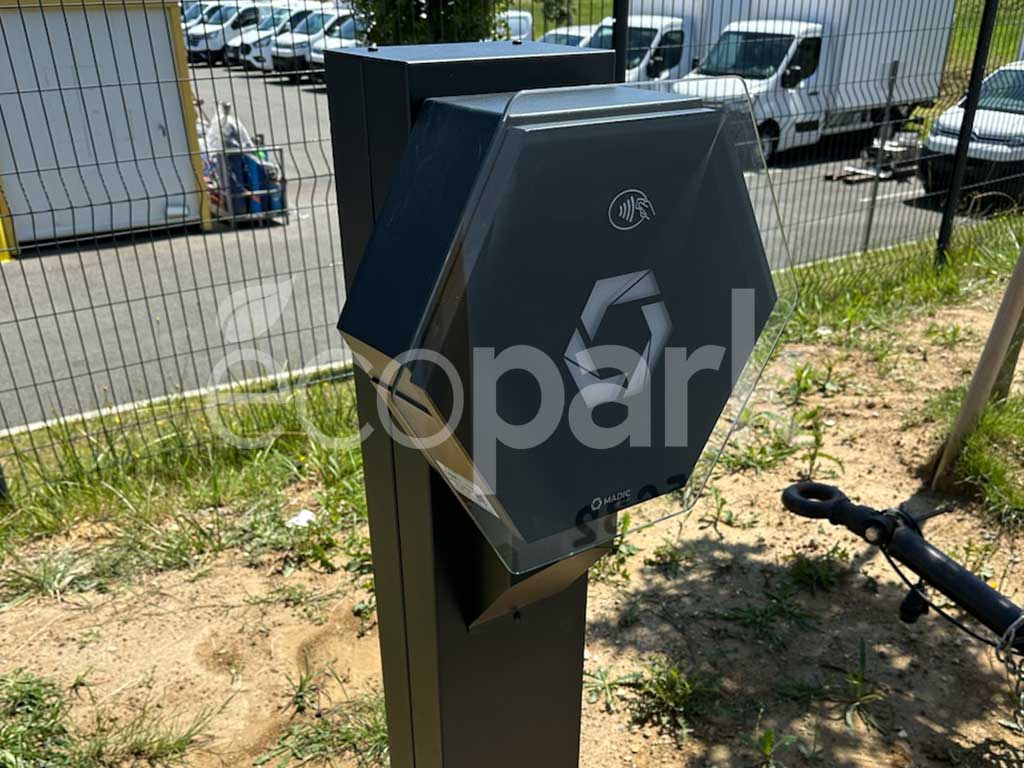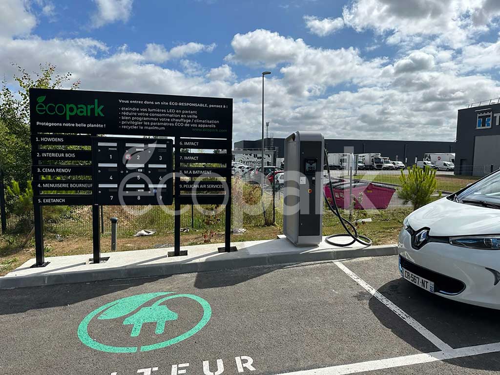 Les écopark sont munient d'ombrières solaires photovoltaïques avec bornes de recharge électrique et d'espaces "rencontre" paysagés et arborés.